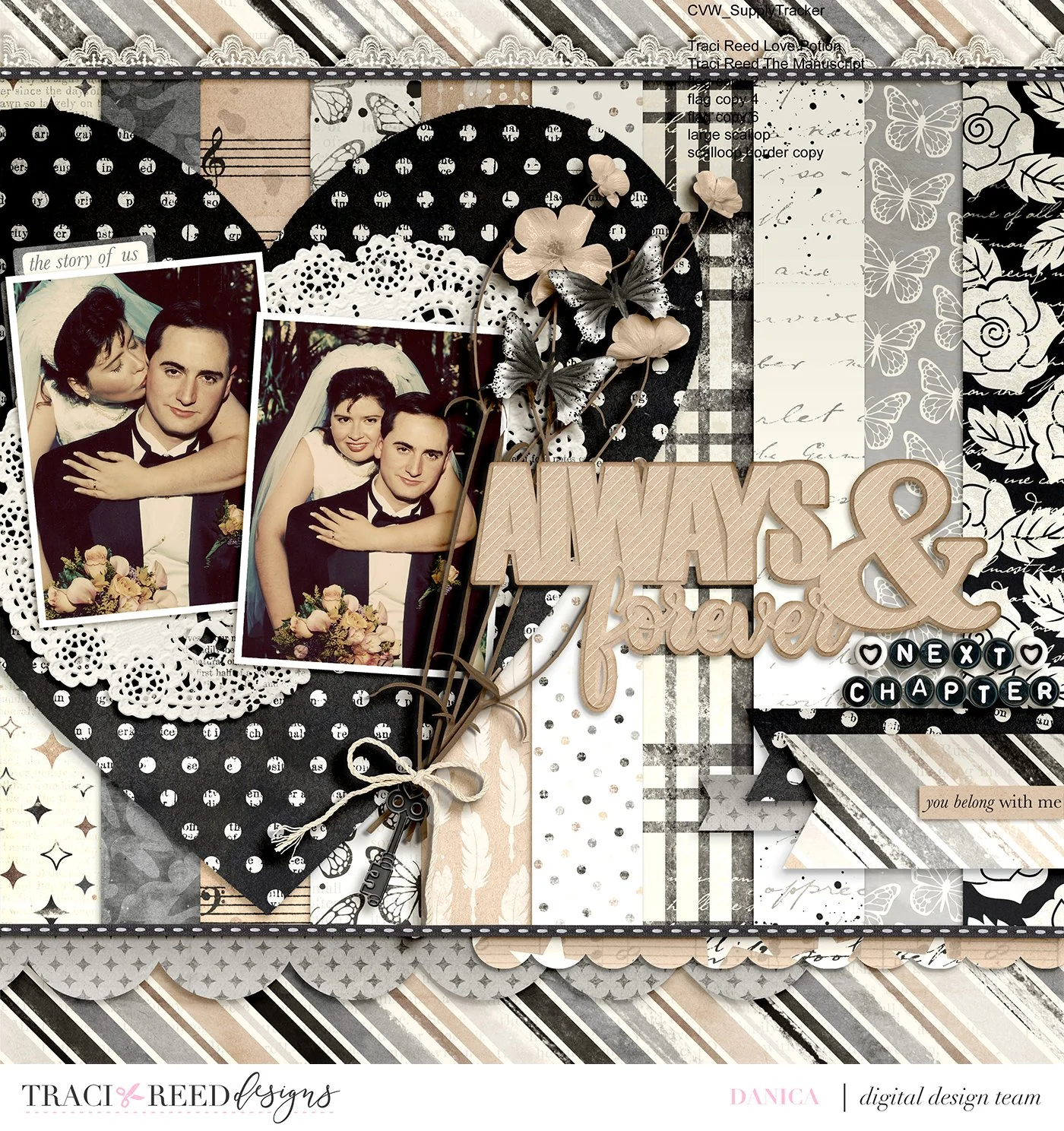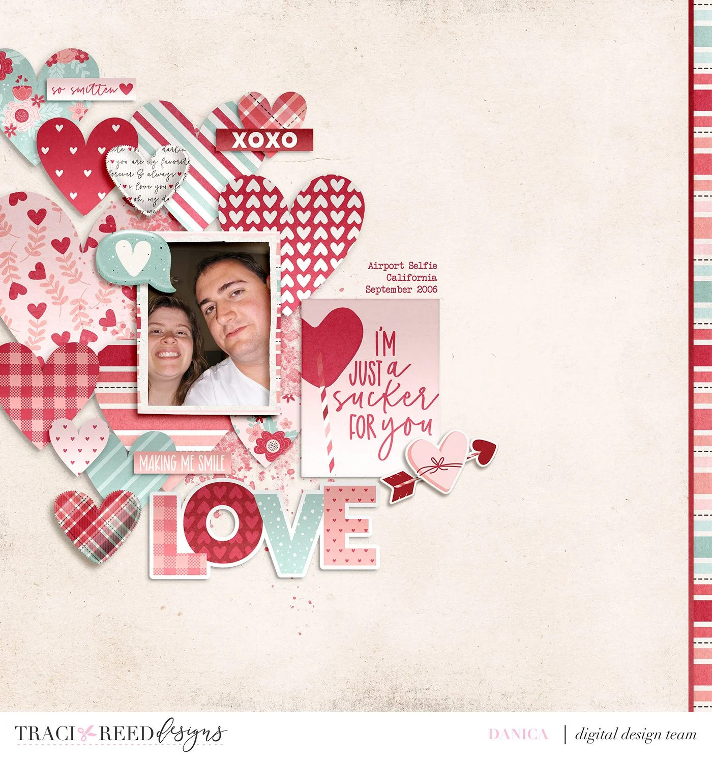 This layout uses a heart template from Designed by Soco as well as I think all of the patterned papers in Traci’s Smitten collection.