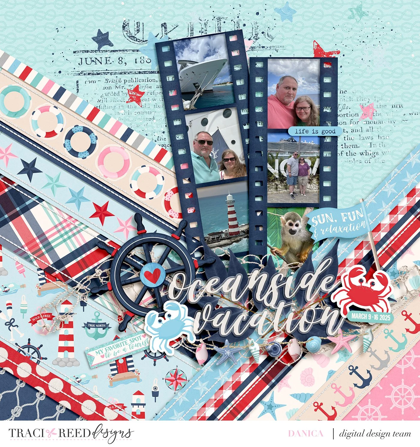 This layout was created with Traci’s True North collection and was lifted from a layout scrapped by fellow creative team member Nichole. The background was created with diagonal strips and then filled in with various papers from the collection. When putting it together, I made sure that the strong linear patterns were centered in the strips like the stars, anchors, etc.