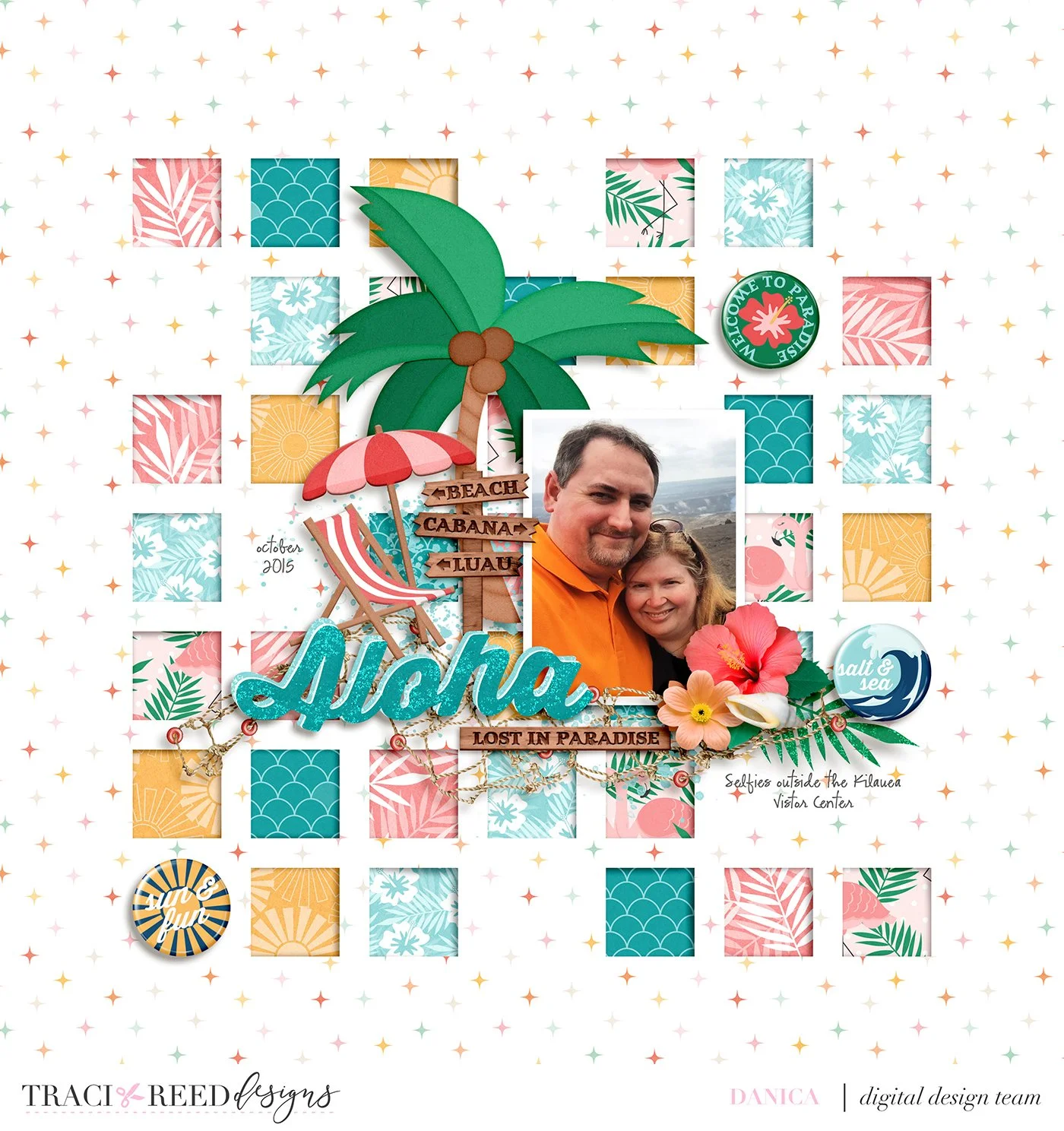 In this fourth layout I used a template from Designed by Soco and Traci’s Island Time. I used six patterned papers in this one. Here I pulled more subtle patterns out of the kit to fill up the squares in the background layer. Subtle patterns or monochromatic pattern papers generally always look good together. Also smaller glimpses of papers are sometimes easier to use together if the patterns are bold.