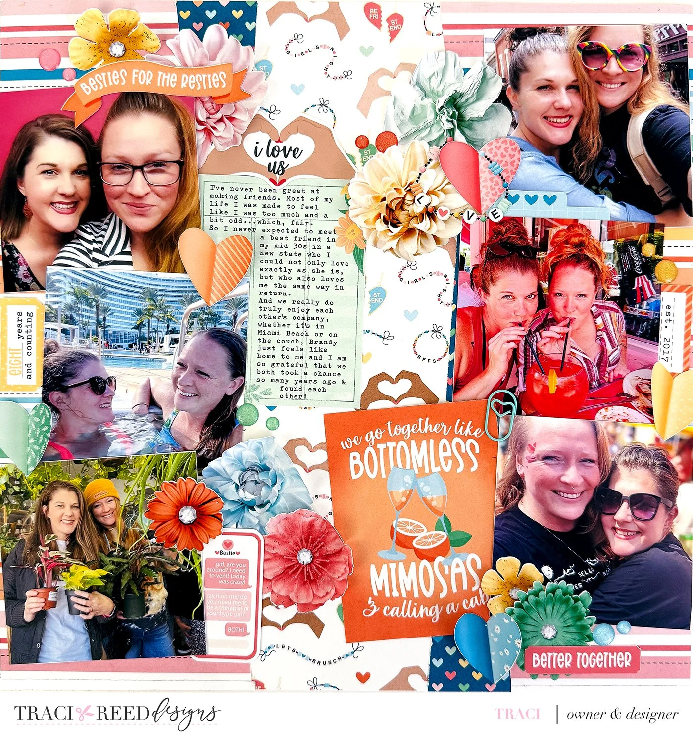 This layout started with one bold design choice: the “Bottomless Mimosas” quote card from the Besties Who Brunch collection. Its bright colors and playful vibe perfectly captured the tone I wanted—fun, joyful, and a little cheeky—so I used it as the visual anchor for the entire page. Everything else radiated out from there.