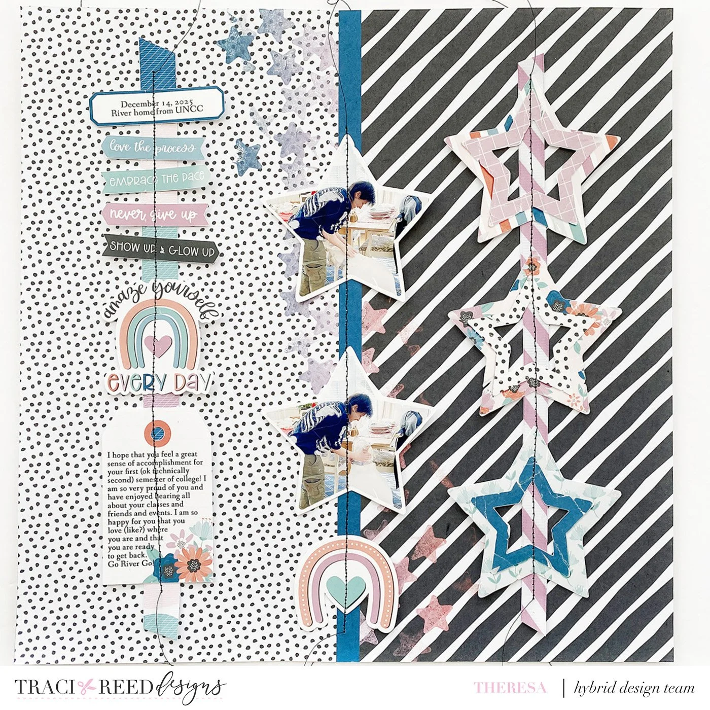 I decided to go slightly off-theme with this collection, with a layout about River finishing up their second semester of university, and how proud I am of their accomplishments! The star embellishments were especially interesting to me, with the two fun layers of patterned papers, so they became the jumping off point for the layout. I decided to arrange the elements onto the page sort of like a mobile hanging on a wall or bulletin board! I turned the photos into stars themselves in Photoshop to repeat the star shape. Then I stitched all of the elements to the page, grounding them with ribbons from the collection and creating the mobile look. This was so much fun to create, I hope you are inspired too!
