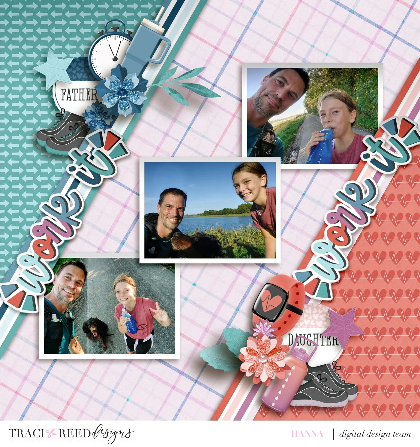 I love the colors in this kit, I immediately thought of these photos of my brother and his daughter working out. They each have their own way of exercising (he runs, she rollerblades) but they do it together. The dog is just happy to tag along anytime. So I decided to create their own sides to the page but have them meet in the middle, in the photos. Love how this page turned out!