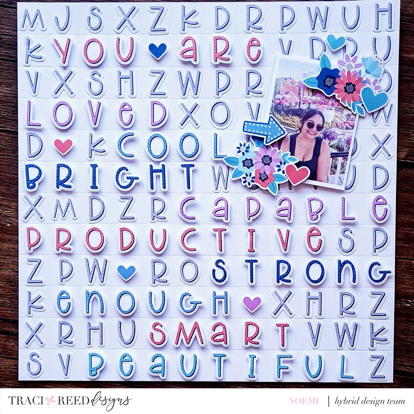 Inspired by that concept, I created a layout filled with affirmation words, and I absolutely loved how it turned out. To keep the letters aligned, I made a grid using a scoring tool and carefully placed each letter inside a 1×1 inch square. I won’t lie, sticking each letter down one by one took quite a while, but I truly enjoyed every step of the process. After that, it just added a 3x4 inch photo and a couple of flowers to finish it.