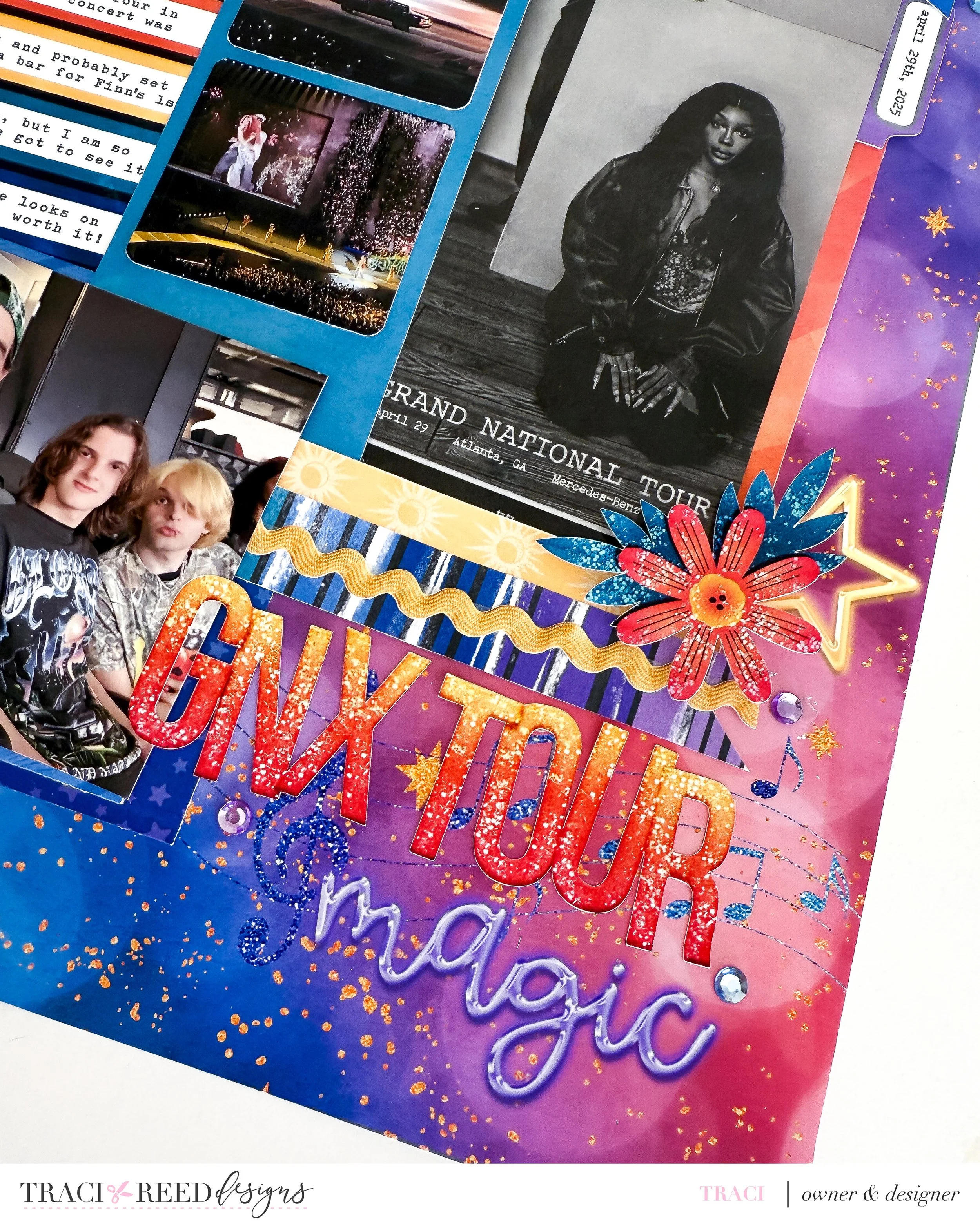 In this layout, I wanted to capture the magic of seeing Kendrick Lamar and SZA on the GNX Tour in Atlanta—a night full of energy, emotion, and unforgettable moments. I had several photos and ephemera I wanted to include: a family selfie, two performance shots, a large “ticket” handed out at the door, and of course, journaling to set the scene. Here’s how I made it all work together:
