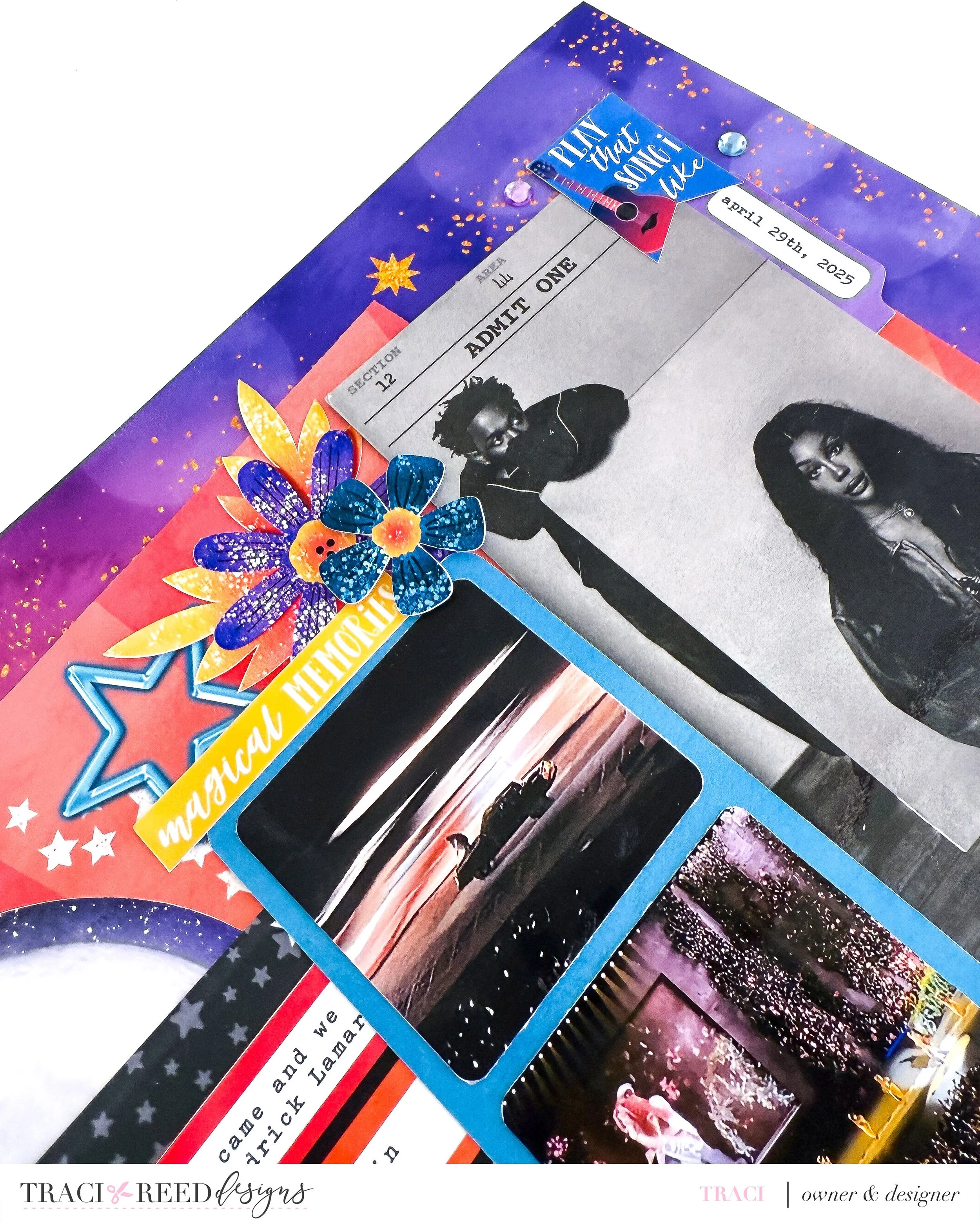 The large family photo in the bottom left corner acts as the anchor for the layout. I framed it with embellishments and gave it visual weight by placing it over darker, bolder background elements. This draws the eye in first and gives the story a human connection before you move on to the concert imagery.