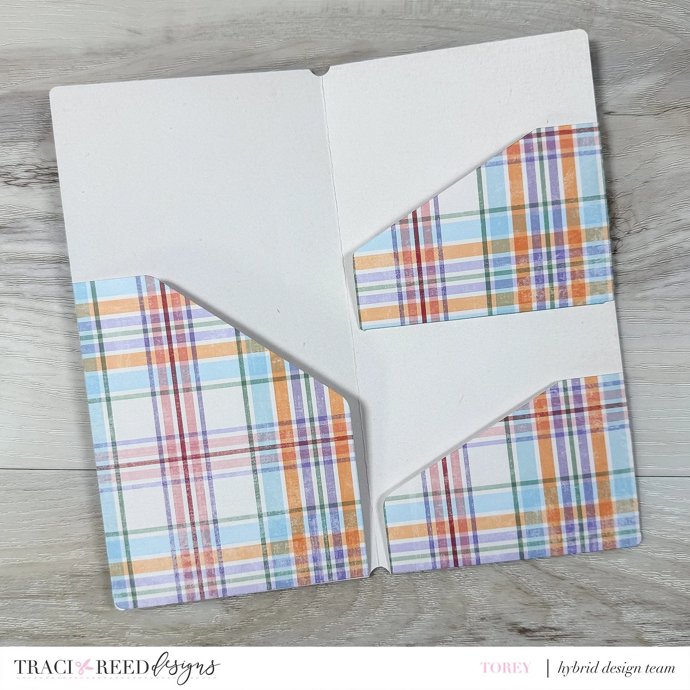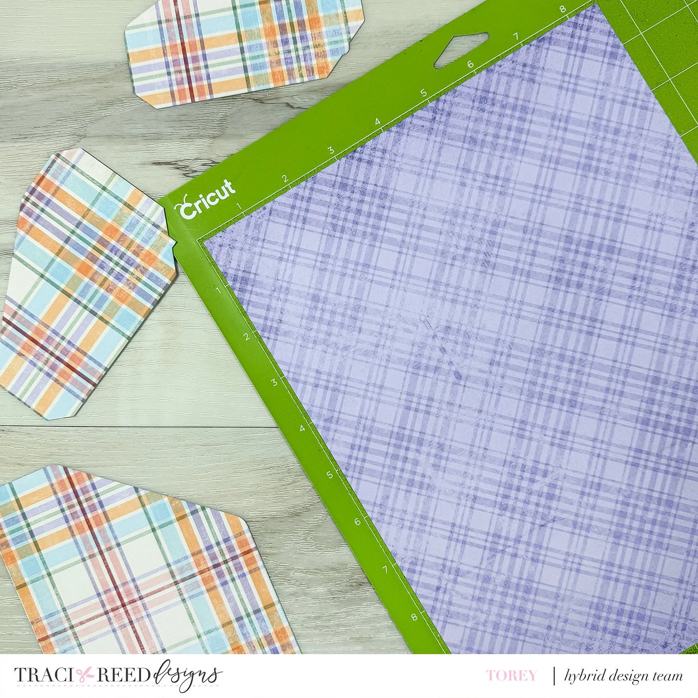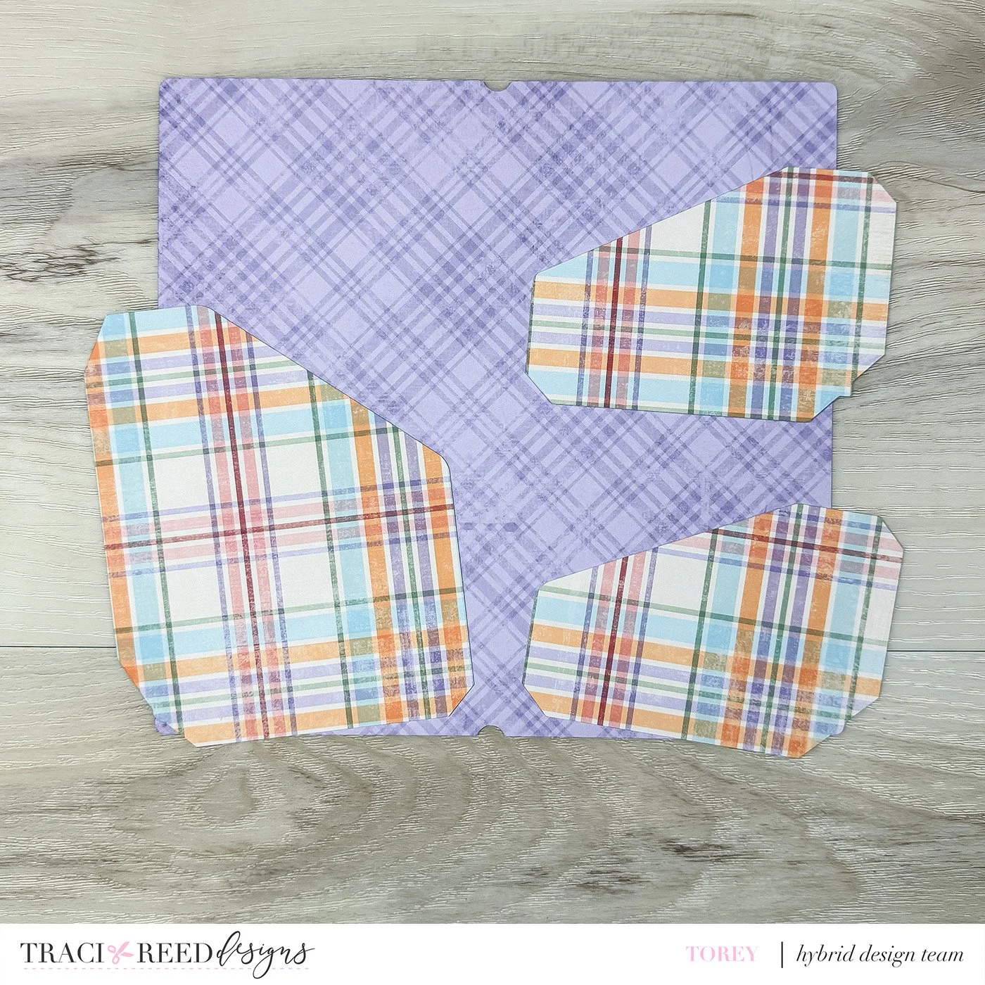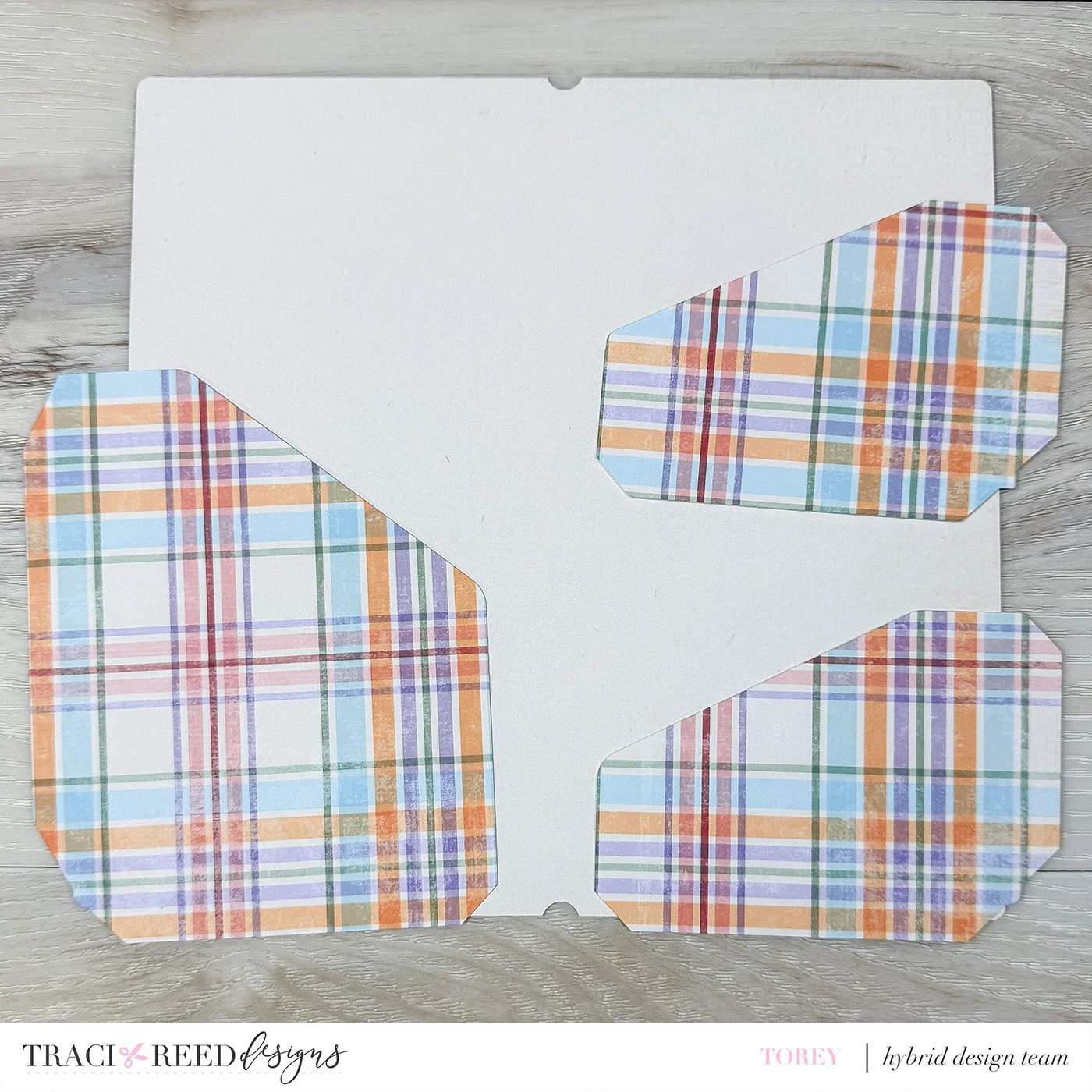 I chose one of the patterned papers for the main part of my folder, but I decided to printed on both sides of this paper. One side had plaid, and the other had a textured solid color from the collection. I did this so that the inside of my folder wouldn’t be stark white.