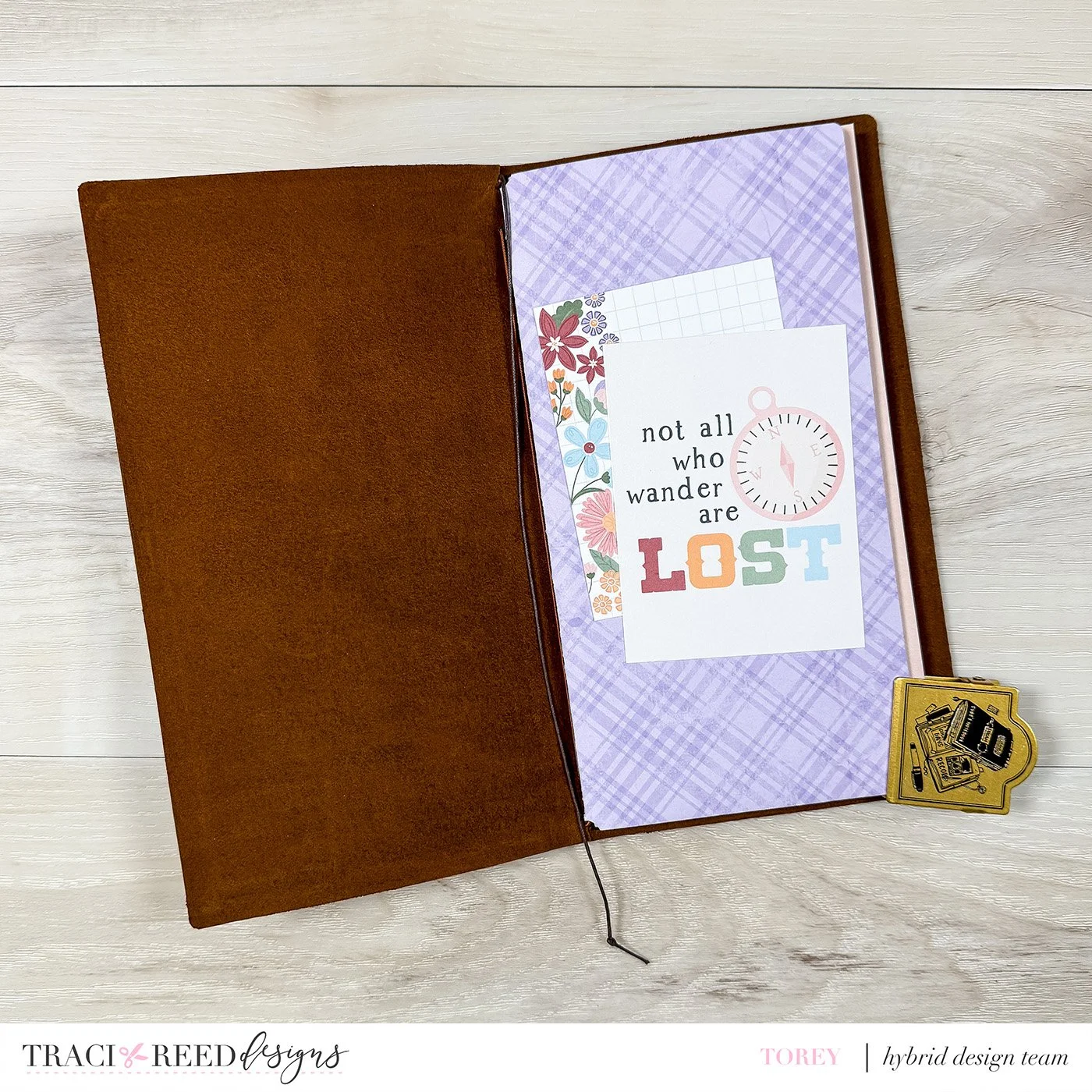 The last thing I did for this project was to add some of the journaling cards from the collection to the front, and create a small insert to add into one of the pockets (I had to make sure they worked of course, hehe). Below is the final product and how it looks in my Traveler’s Notebook cover.