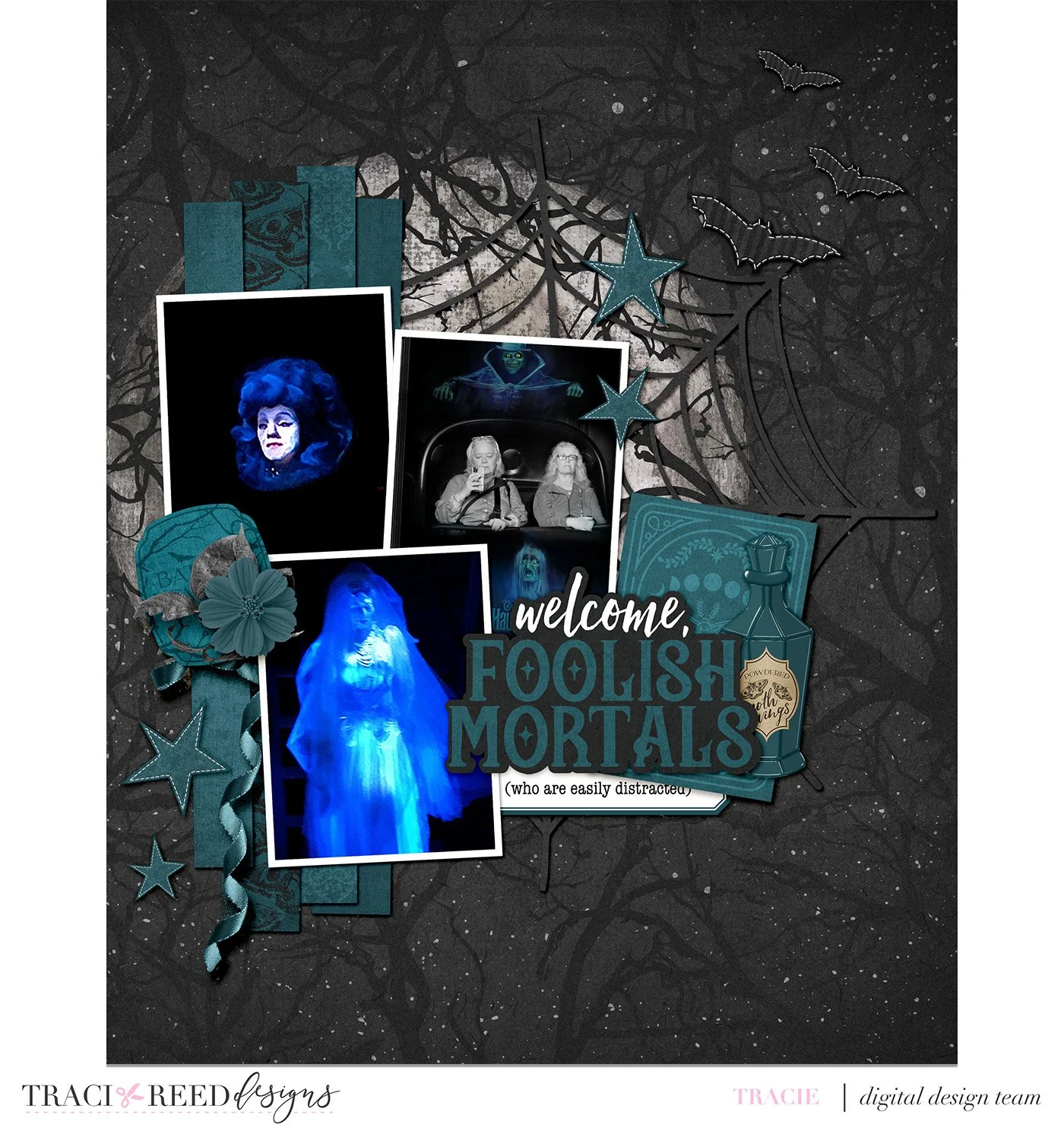 I love to go to Disney and I love finding new products to use on my pages. The “Welcome Foolish Mortals” word art from the Midnight Apothecary was my starting point/inspiration for this page. Most of my books are 8x10, so I selected the elements from the sketch and dragged them onto my 8x10 canvas. From there I went with a two toned theme… the dark black and teal color from the ride photo. The sketch was such a great jumping off point!