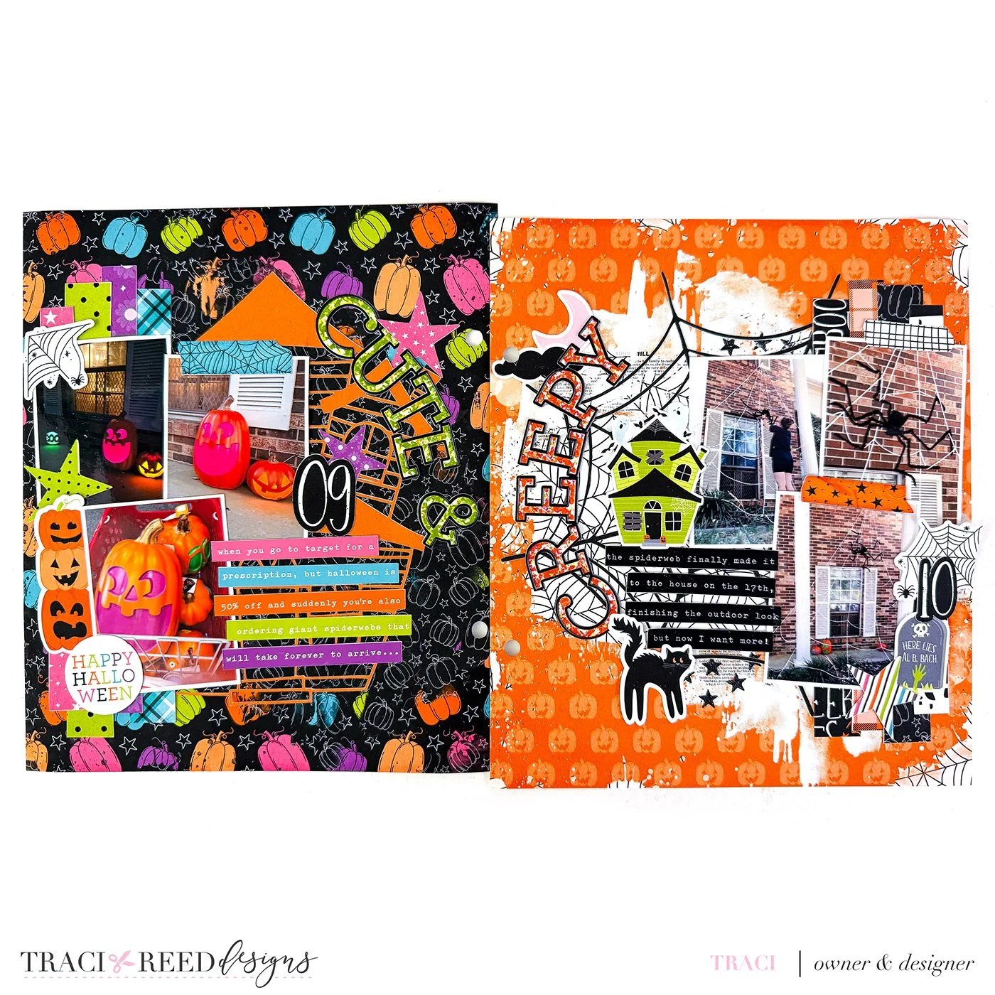 I loved this easy sketch so much I turned it into a two pager with the Haunting collection for my October Daily! I captured two stories of our new outdoor decor that went together and used two different color ways from the same collection to both separate the two pages AND make them flow together. For the “spiderweb” element on the left side, I used the haunted house cut file from Haunting instead. I love how these two pages look different but coordinate so you can tell they’re two stories that go together!